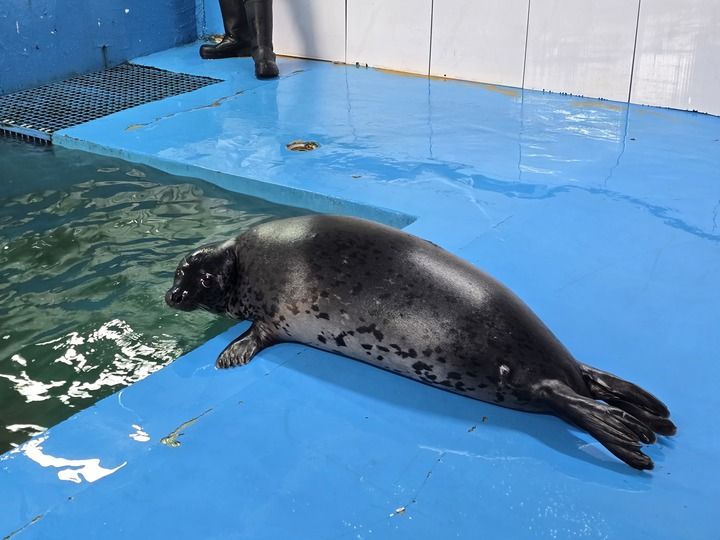在辽宁省海科院的一处救助池内,记者看到了“娜娜”。它活泼、可爱,眼睛圆溜溜的,透露着好奇和兴奋,只见它从水中一跃而上,或在地面上来回滑动,或站起身扑向记者,浑身透着快乐。