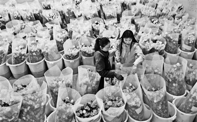 2月1日,在甘肃省临夏市枹罕镇的亿农国际鲜花港保鲜冷藏室内,工人在整理鲜花,供应节日市场。新华社发(史有东 摄)